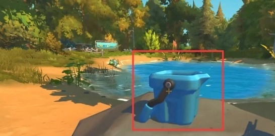 1、玩家在生存模式出生地向右走,可以看见一个水池,水池前面有一个水桶,将水桶拿走。