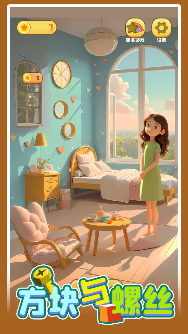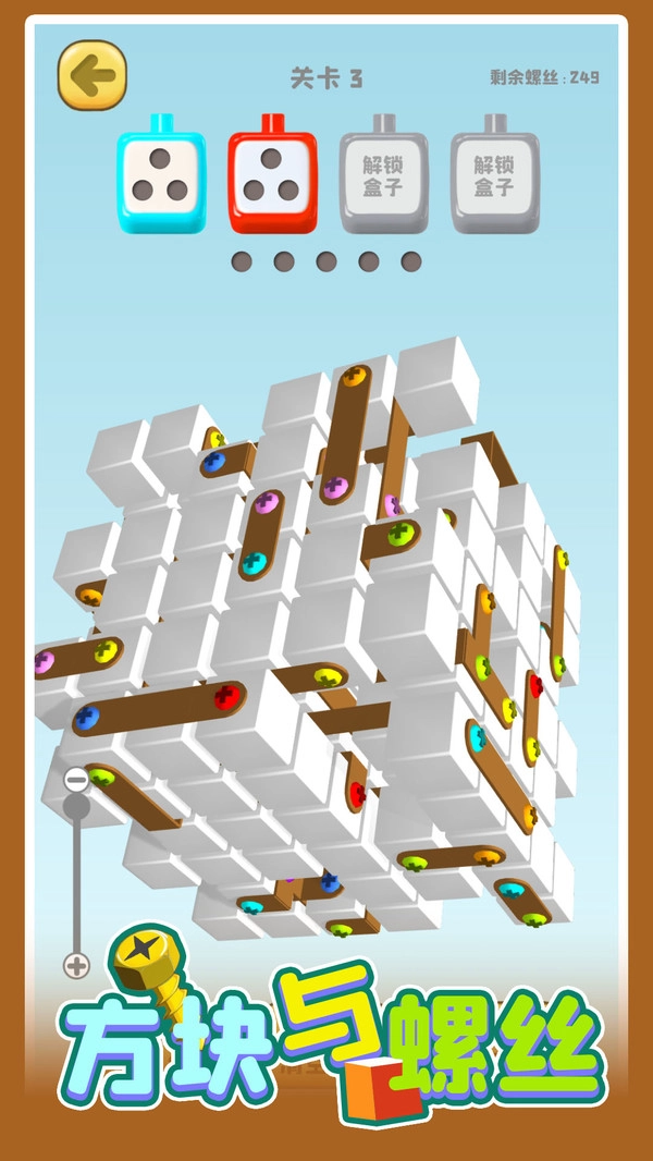 《方块与螺丝》是一款极具挑战性的消除类益智游戏。游戏中,玩家将面对由彩色螺丝构成的立体方块,根据任务板的要求,挑选对应颜色的螺丝并按特定顺序拧下,当凑齐三个同色螺丝时即可完成消除。随着关卡的逐步深入,螺丝的颜色种类会不断增加,游戏难度也随之提升,对玩家的策略规划能力和敏锐观察力都是极大的考验。