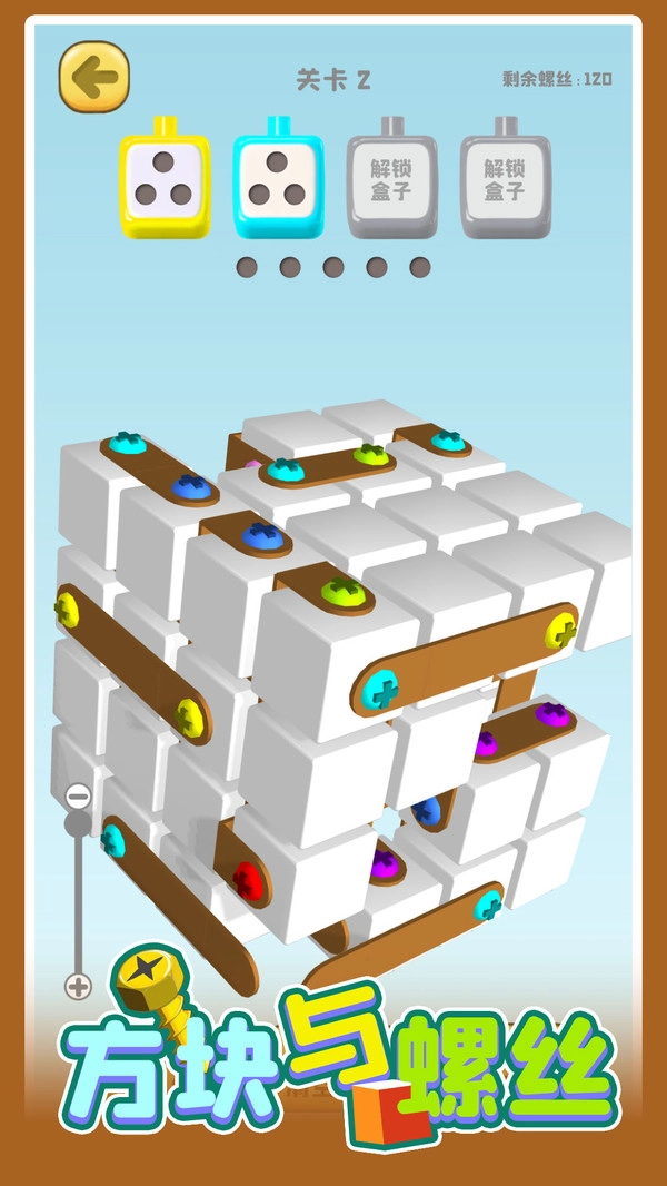 2、遇到复杂方块,旋转视角,看全螺丝分布,优先思考怎么搭配颜色消除。