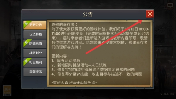 3、若弹出更新公告,查看周五活动、末日试炼等相关内容后,可点击右上角关闭公告,也能参与活动领取奖励;之后操控角色,抵御丧尸侵袭,推动剧情发展,提升生存作战能力。
