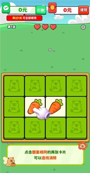 1、在本站游戏,玩家根据引导点击相同图案的两张卡牌,可以连线消除。