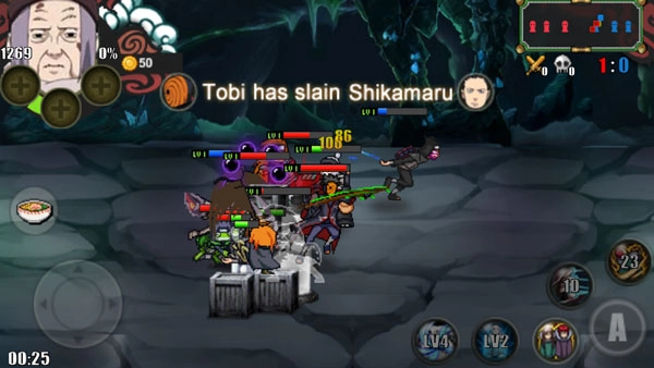 游戏对战采用系统随机匹配机制,玩家将与两名队友并肩作战,对抗三名随机对手。想要赢得胜利,需击败所有敌方忍者,并摧毁对方三座防御塔。胜利后可获得金币奖励,这些金币能用于角色升级,解锁专属特殊技能,让你的忍者实力更上一层楼。