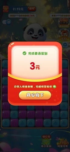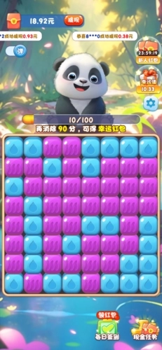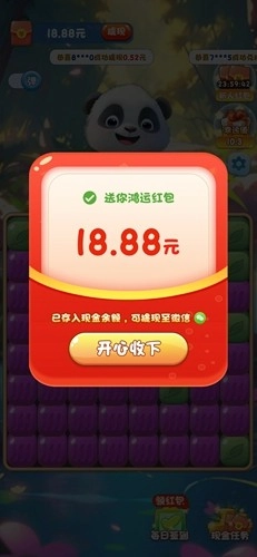 熊猫滚滚乐红包版是一款有趣的休闲消除游戏,里面包含了不少精彩的玩法内容。玩家能在这里轻松开启游戏体验,享受丰富多样的趣味环节,每次消除成功后还能领取红包福利。这款赚钱软件的玩法十分简单,采用经典的消除模式,只要消除相同颜色的方块就能获取红包奖励,消除的数量越多、得分越高,得到的奖励就越丰厚。另外,新手首次登录时还能额外获得现金红包奖励呢。