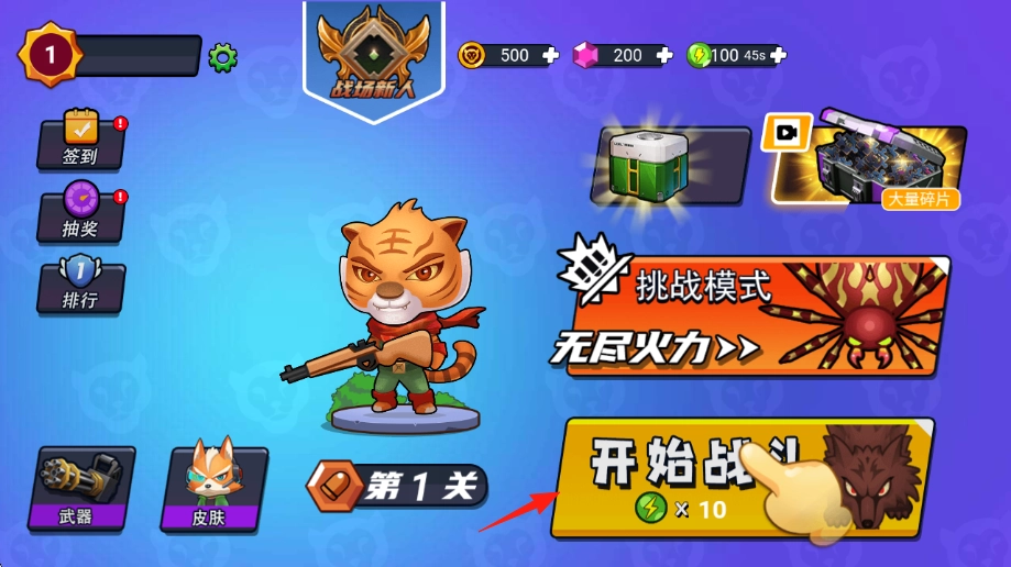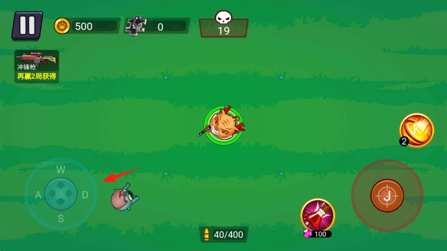 1、点击标有红箭头的【开始战斗】按钮,进入第1关;操作上通过虚拟摇杆(WASD键)控制移动,右侧按钮负责射击,先熟悉这些基础操作。