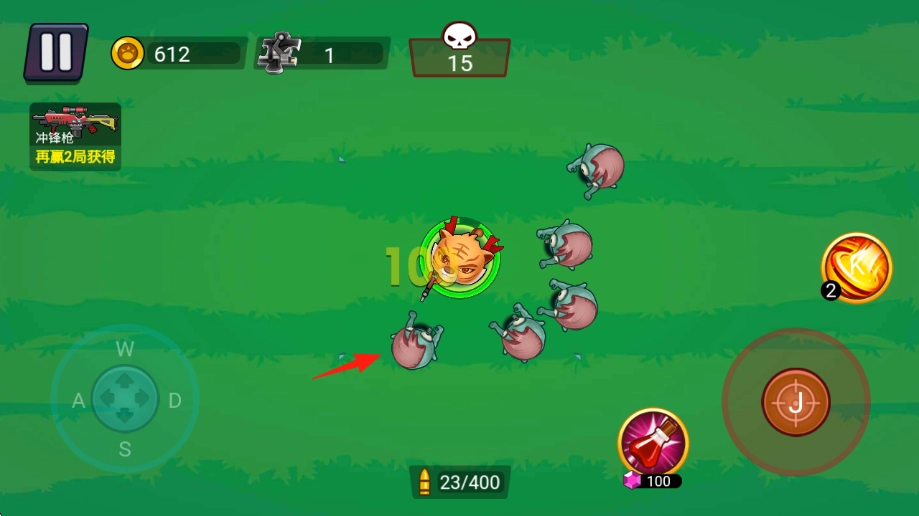 3、遭遇围堵时(红箭头标识),按下技能键(K键)进行清场,随后拾取掉落的金币(数量为612),利用金币升级武器装备,以此推进关卡进度,进而解锁全新的挑战内容。