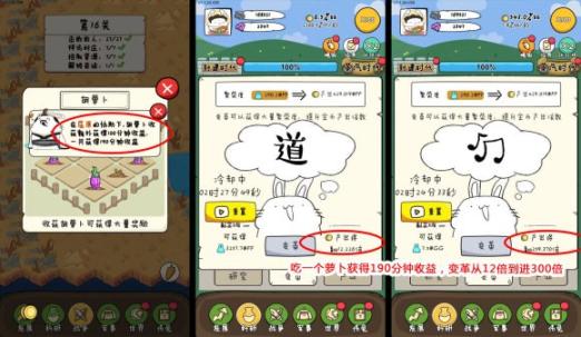 做完以上动作,就要找萝卜了,战争、早晚餐、世界中的周末神兽挑战都可以获得不同时间段的金币收益,同时也会增加繁荣度推高翻倍率,萝卜不能连续吃,要吃一个变革一次,或者神兽挑战一次变革一次,不要连续吃或者连续挑战,原理就是比如吃一个萝卜翻倍300倍,连续吃两个就是加法600倍,吃一个变革一次就是乘法300*300=90000倍