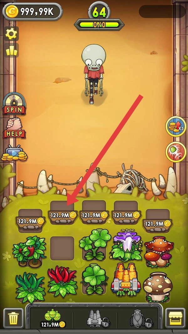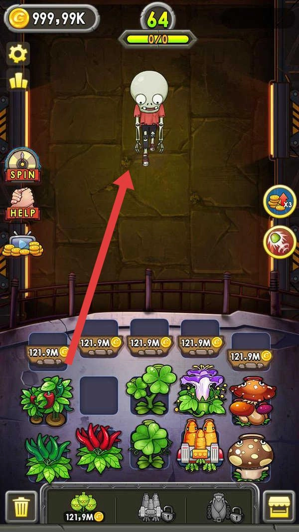 1、通过点击【SPIN】按钮,转动获取资源,用于解锁或升级下方植物,提升对抗僵尸的能力。