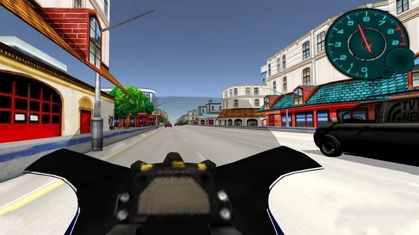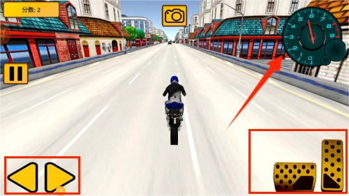 左下角的箭头用于控制左右行进方向,右下角的踏板分别对应刹车与油门,而上方则是摩托车的转速表盘。
