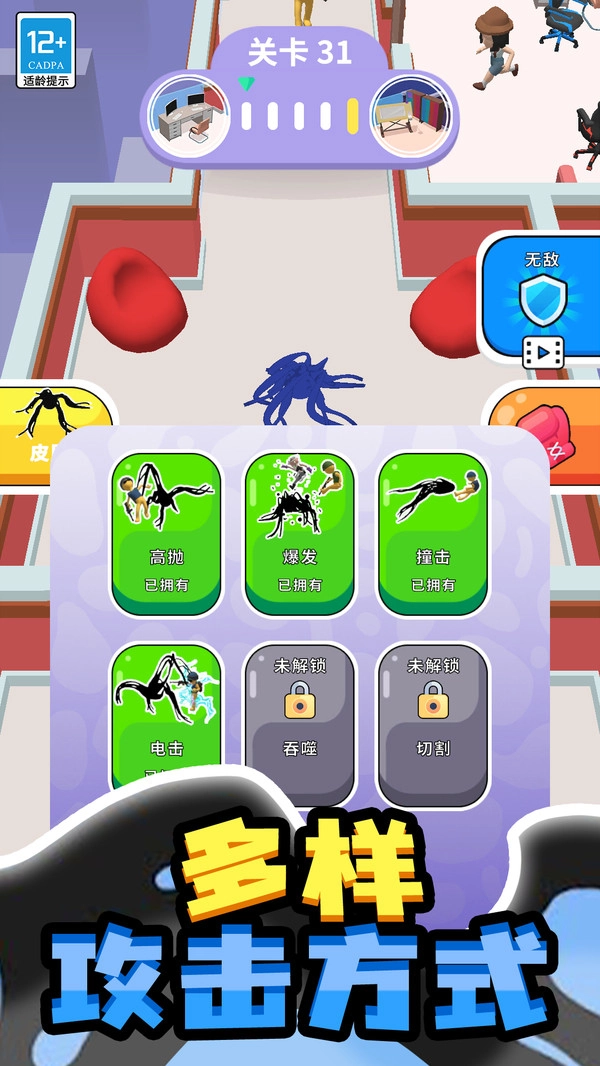 《百变小怪》是一款极具可玩性的动作闯关游戏。在游戏里,玩家要操控一个无形体的怪物挑战各个关卡。初始时,这个怪物仅掌握少数攻击动作,玩家可利用闯关获得的金币解锁更多攻击招式;当击杀敌人达到一定数量后,怪物还能进入狂热状态。