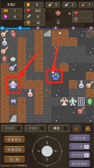 2、接着操控角色移动至地图中拿取金钥匙、银钥匙、铜钥匙、药水、宝石等道具,遇到敌人时发起攻击并将其击杀。