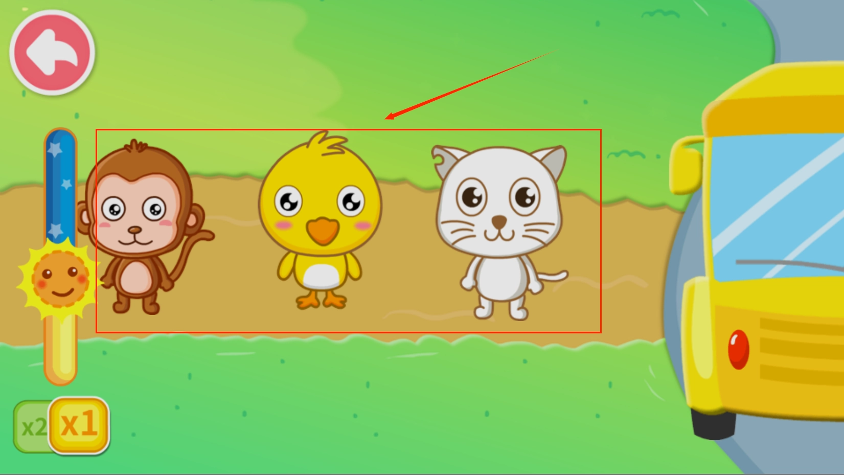 2、点击小车,会看到三个小动物站在那儿,左边是一个类似于电灯开关。