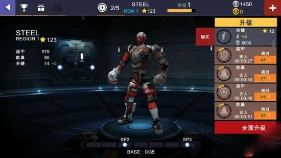 玩家可以拥有多个战斗机器人,但第一个机器人当然是《铁甲钢拳》里的主角——亚当。在进入正式战斗前,我们要先简单升级一下装备。装备升级完毕,开始职业战斗!