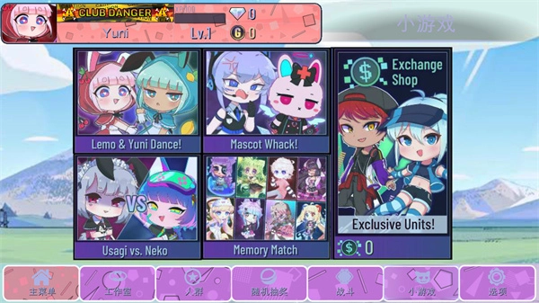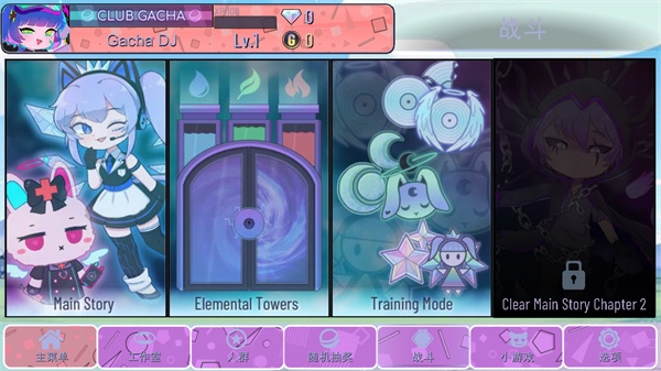 进入游戏后,你会看到主菜单、工作室、人群、随机抽奖、战斗、小游戏等多个功能板块。