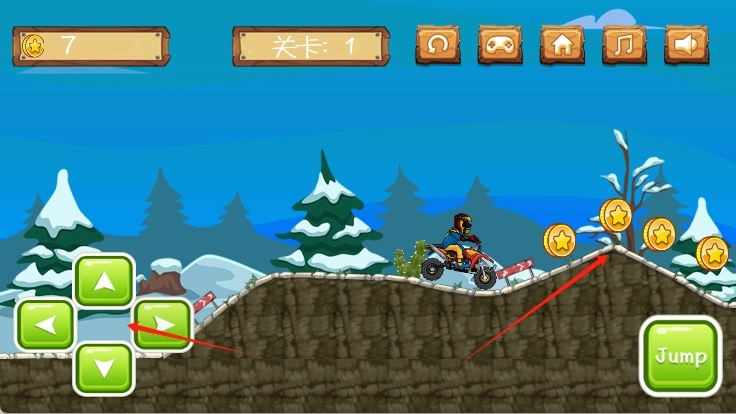 1、基础操控:借助虚拟按键实现摩托车的加速、刹车与跳跃动作,长按跳跃键能完成后空翻这类高阶操作,在空中时需调整车身姿态确保平稳落地。