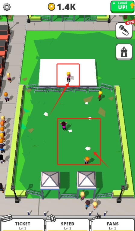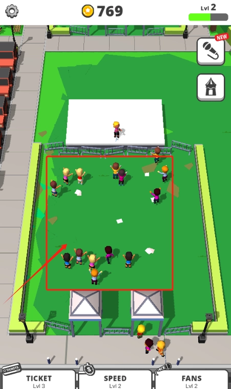 1、在演唱会场景中,点击红框里的观众可以增加粉丝数量,界面上方会显示当前拥有的金币数量和各类升级选项,方便随时提升演出配置。