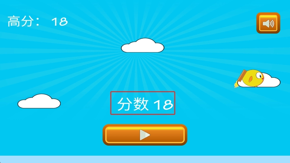 1、点击橙色带三角箭头的开始按钮,进入小黄鸟飞行挑战环节,先留意界面底部的喷气按钮,长按能让小鸡升空,短按就是小幅度跳跃。