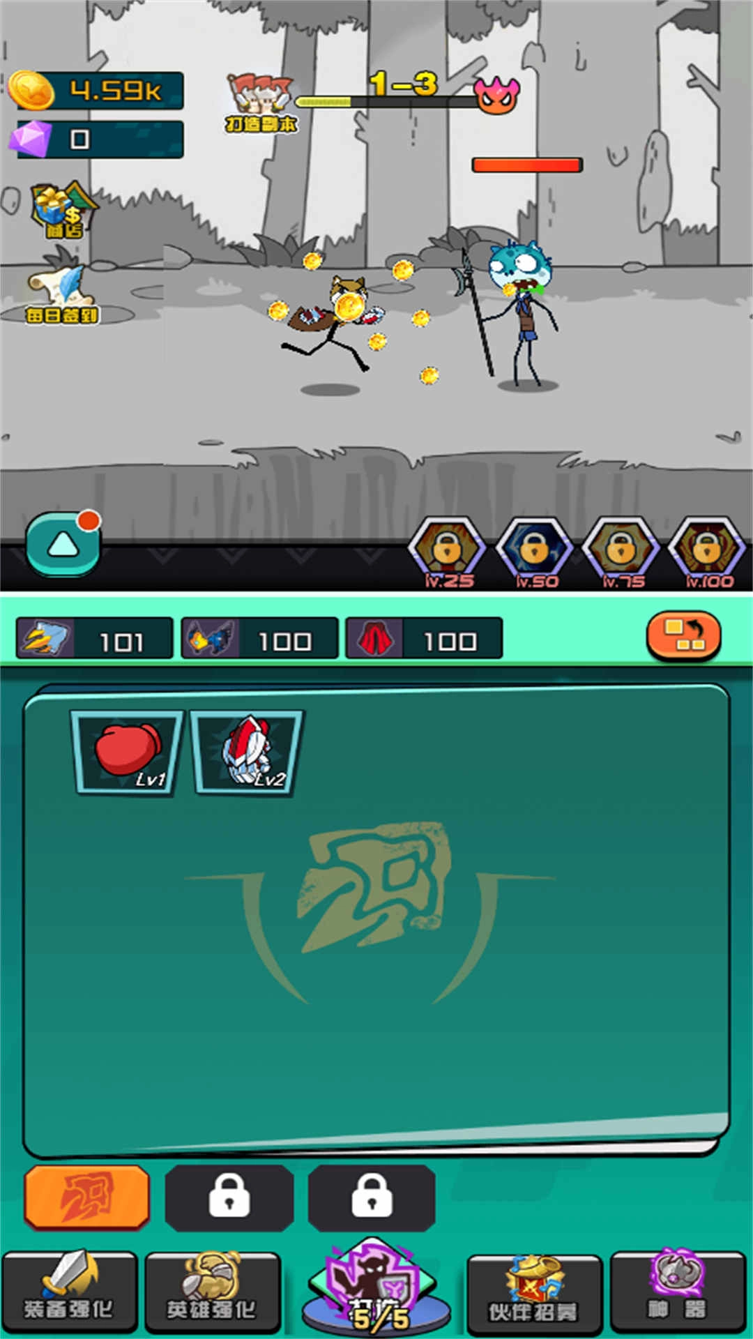2、要带领狗头勇士参与战斗,积累金币钻石,利用这些资源强化装备、英雄,合理搭配技能,攻克一个个难关。