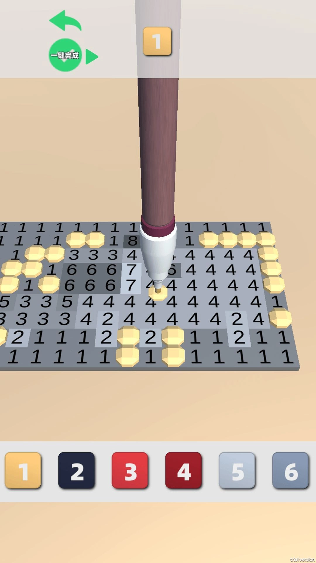 1、进入关卡1,界面有带数字的网格,下方数字按钮1-6,选对应数字,画笔自动找网格中同数字区域。