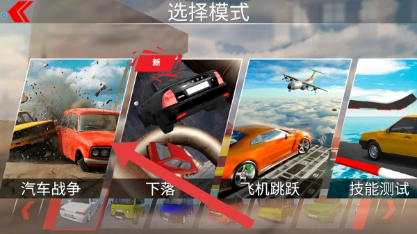 2、目前处于选择模式的页面,有汽车战争、下落、飞机跳跃等,可根据提示点击第1个进入场景进行游玩。