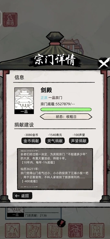 宗门进阶:可消耗金币/寿元/声望增长宗门底蕴,底蕴到达上限宗门品质+1,获得3个建设点