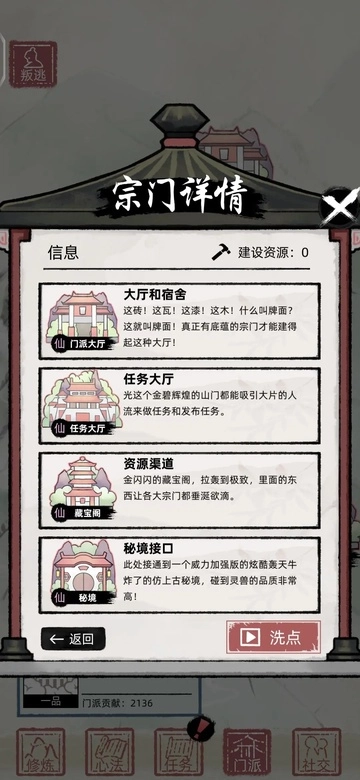宗门建设:可消耗建设点升级四种宗门设施,凡,玄,灵,仙