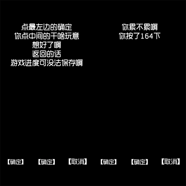 要是打算回到主界面,游戏会提示你点击左边的【确定】,可中间明明还有另一个【确定】。这时候要是我们耍点“抬杠的性子”,偏就只点中间那个【确定】,那它立马就变成一款“点击式解压游戏”——只要不停地点击,游戏就会一直跟你耗着……直到点够2000下为止。