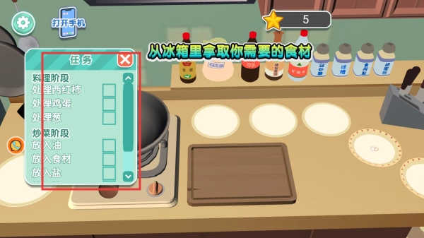 1、按任务备食材:根据任务提示,挑选所需的食材并进行处理,如清洗、切配等,确保食材状态符合烹饪要求,为后续步骤打下基础。