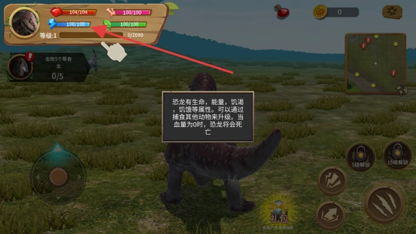 3、可通过左侧摇杆控制恐龙移动,右侧有多种技能按钮,可根据情况使用技能,同时完成击败小型食草龙0/5等任务。