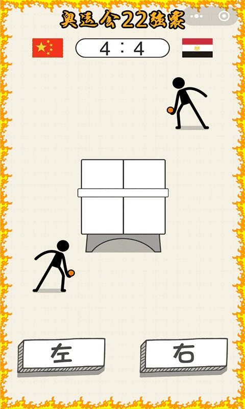 游戏随即开始,《乒乓球王者》的操作方式十分简单,仅设有左右两个按钮。玩家需要观察对手回球的落点——若乒乓球落在左侧球台,就立刻按下左按钮;若落在右侧球台,则马上按右按钮。