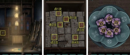 11、打开柜子,依据花瓶给出的线索,点击对应图案的骨灰盒。(花蕊的数量对应点击的次数)