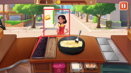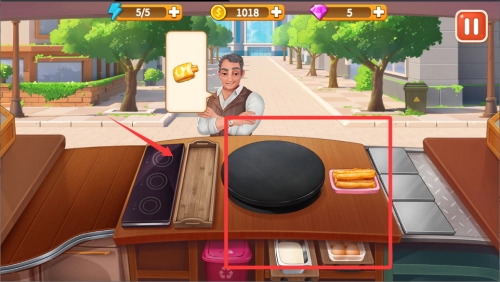 1、接单制作流程,顾客头顶会显示想吃的食物图标,迅速点击对应厨具开始制作,并在进度条结束前完成装盘。