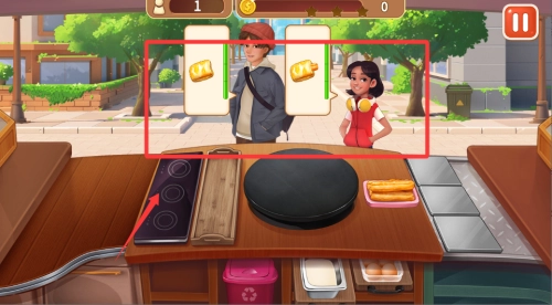 1、进入游戏后先熟悉餐车操作,点击顾客头像查看他们想要的餐品图片,快速识别后开始制作。