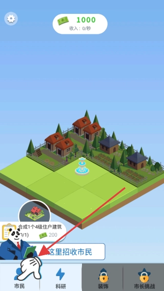 3、进入甘泉村界面后,若需招收市民,可点击对应按钮完成操作;此外,还能开展科研、装饰布置、市场挑战等活动,以此推动城市发展、增加收益并达成任务目标。