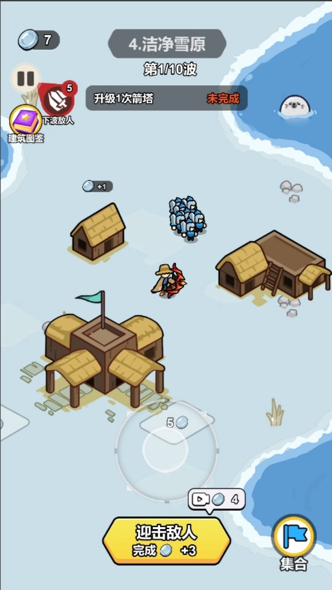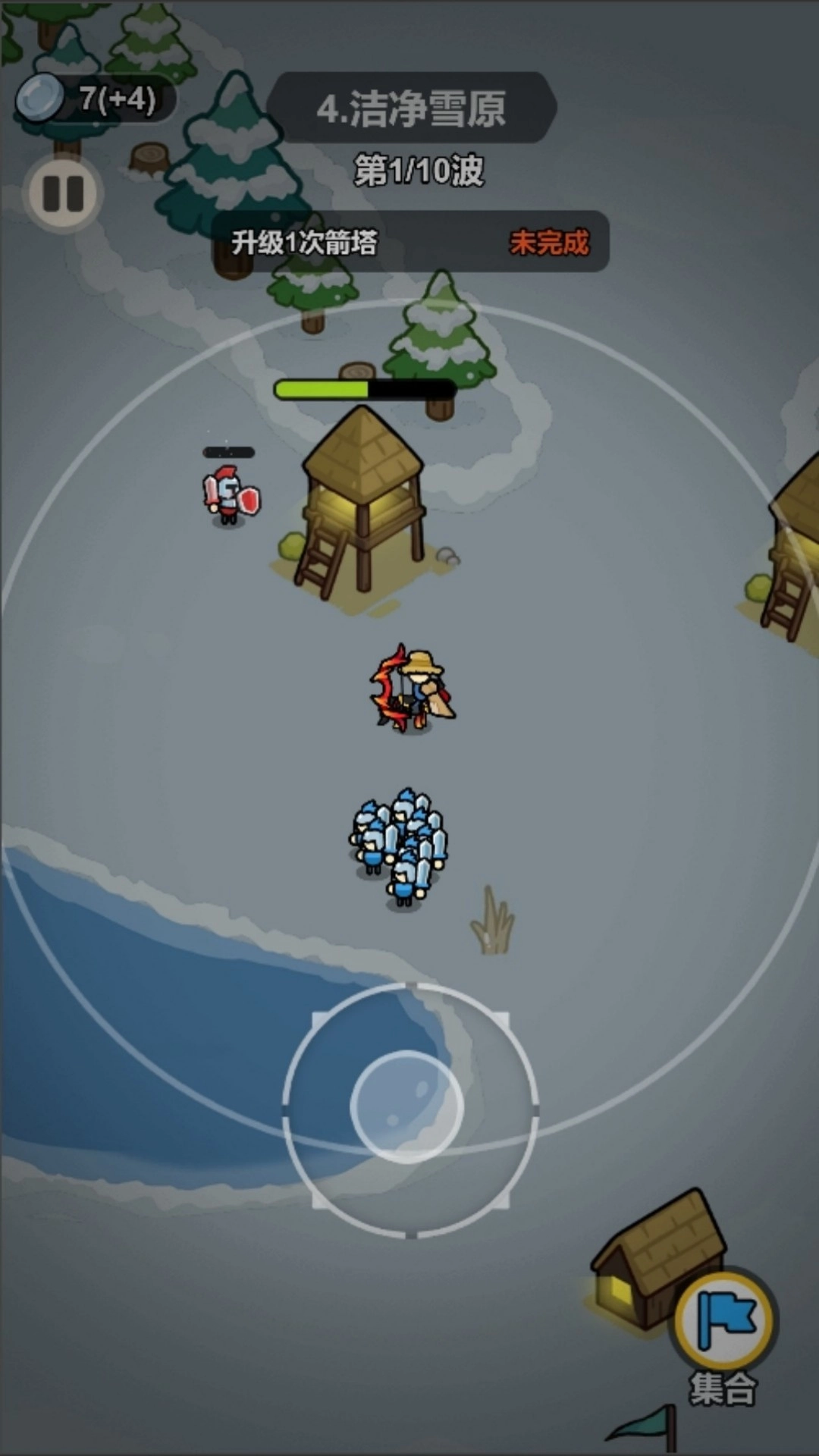 3、战斗中观察敌人动向,点击士兵图标可指挥其增援薄弱区域,双击箭塔可临时提升其攻击速度,应对紧急情况。