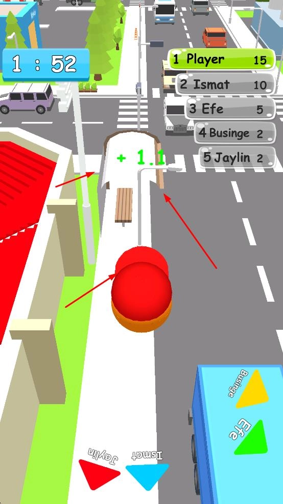 2、在街道场景里操控滚球移动,穿过特定区域就能得到分数奖励,积累分数可以提高排名。