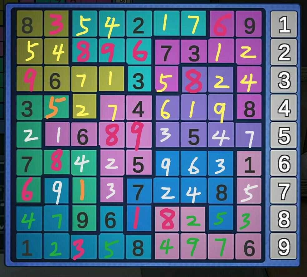 ①游戏里包含一个数独小游戏,其颜色与位置是固定一致的,但初始呈现的数字存在差异,因此最终得出的结果也可能有所不同。本帖仅针对其中一种解法进行说明。