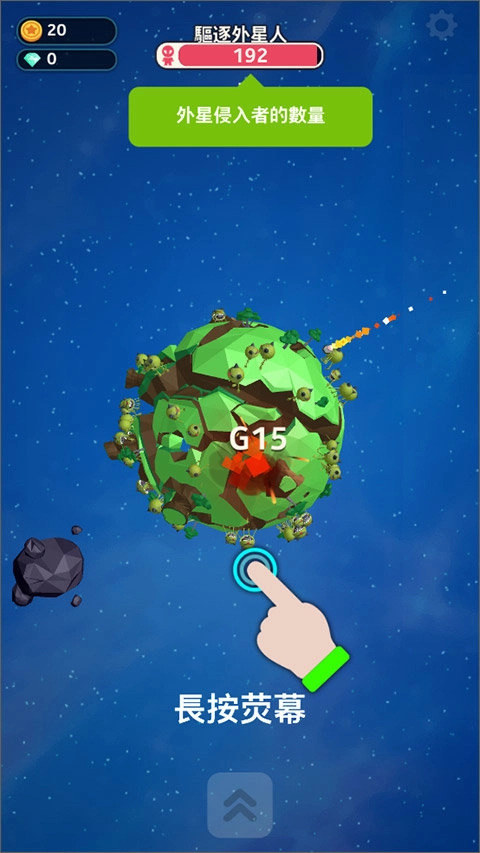 3、玩家长按屏幕可以积攒能量释放大招一举消灭更多的外行星人;