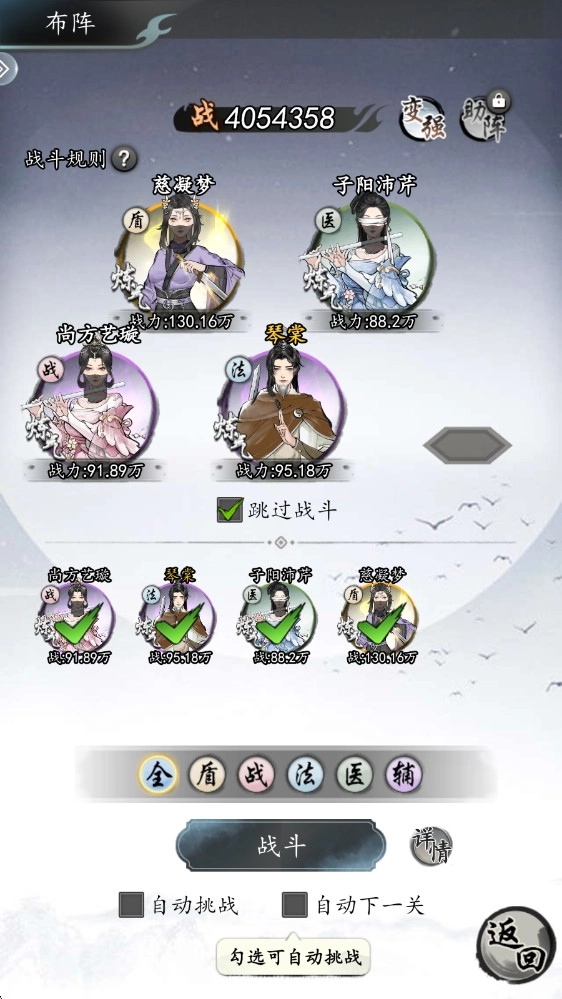 5、站位策略:在优先将资源分配给法师的前提下,前排位置可以安排法盾角色。当遇到无法通过的关卡时,建议仔细观察战斗过程,针对性地调整各职业的站位,往往能收获意想不到的效果。要是战力差距不大,也可以尝试多次点击跳过按钮,说不定能顺利通关。