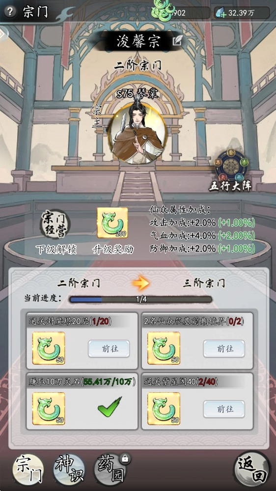 4、随后我们返回主界面,进入宗门系统,需通过完成各类任务来提升宗门等级,以此解锁更多新的挑战内容。