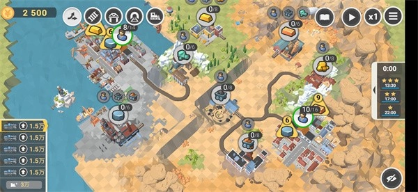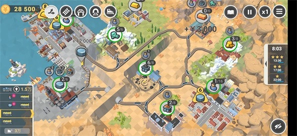 1、开局先将底部的碎石场与沙土厂连接起来,派送人口,接着把上方的桥和煤场连通,进行煤炭加工;