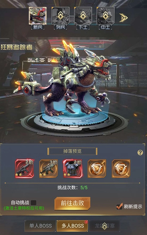 挑战单人BOSS能获取角色装备,玩家的等级与晋升等级越高,可解锁的BOSS数量就越多。每个BOSS每天都能挑战2次,SVIP2等级可开启一键扫荡功能,无需手动挑战就能直接领取奖励。