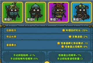 2、顾客头顶的泡泡代表着他们想吃的料理,怪物蛋能够孵化出怪物的全新独特造型,这类似于皮肤功能,并且每个皮肤都带有不同的全局属性加成,玩家可通过点击养殖场中的品系选项来切换皮肤。
