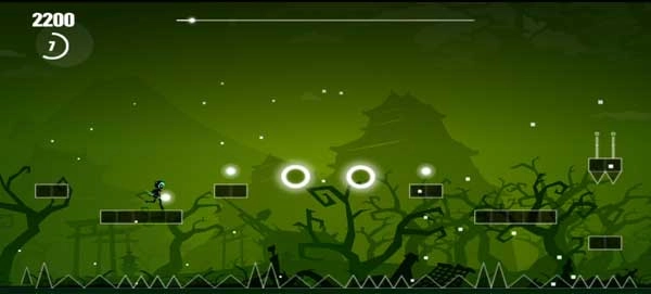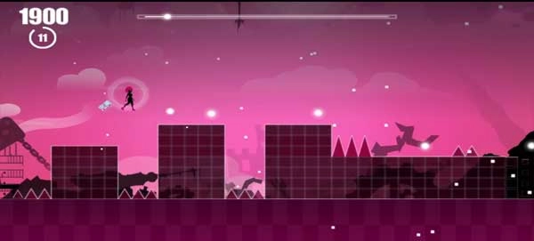 4、除了上述这些功能键,这里再为大家介绍一下左下角的双箭头按钮——它能让角色在一定时间内免受尖刺等陷阱的伤害。玩家在跑酷时,需要触碰那些发光的圆圈来收集上方的光源,直到将光源的进度条填满。