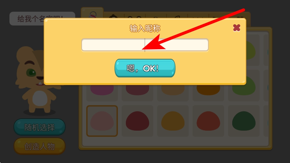1、进入游戏时,会出现输入昵称的界面,随机选择一个人物即可创建人物,完成萌宠昵称的设置。