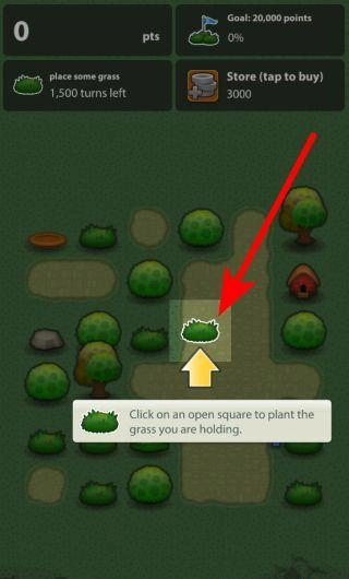 1、按照提示,点击空旷方格,可放置手中的草地,不断放置草地,能逐步改变场景,同时积累积分。