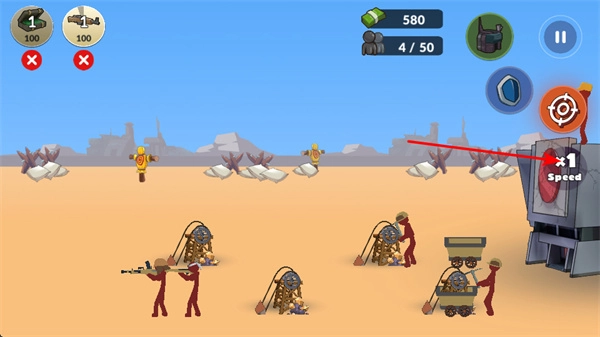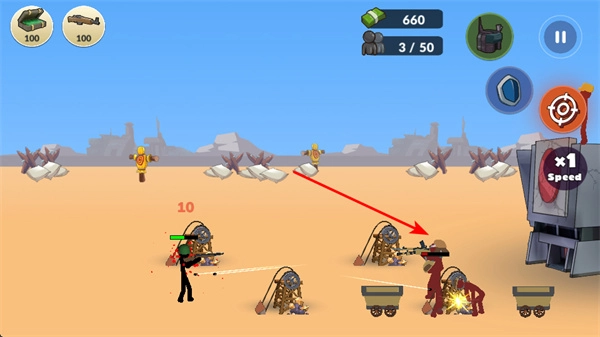 1、根据手势指引,点击箭头标识区域,可指挥火柴人士兵移动,调整其战斗位置,更好参与战斗。