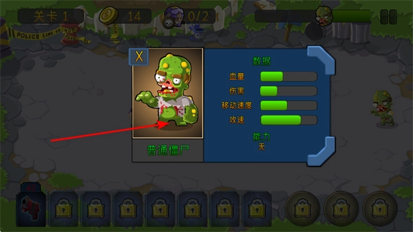 2、遇到普通僵尸时,可查看其数据面板,了解其血量、伤害等属性,以便针对性地部署战斗单位。