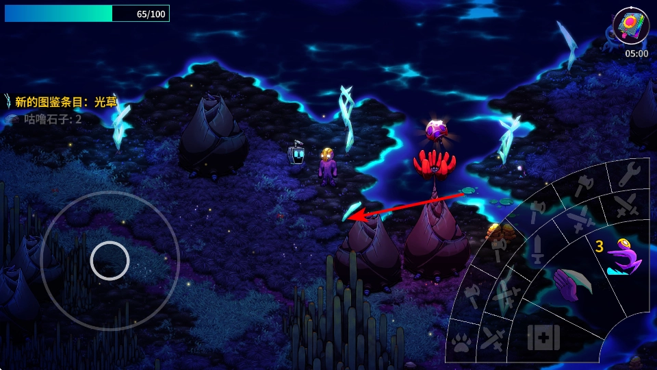 2、靠近场景中的光草等植物,可触发互动,获取资源或解锁新的图鉴条目,丰富游戏探索的内容。