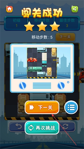 4、成功将红色小车移出停车场,出现闯关成功界面,点击下一关进入新关卡挑战。