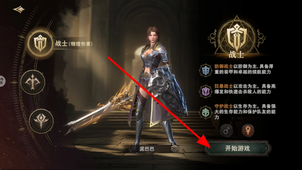 1、角色创建挑选战士等职业,不同战士分支有不同特点,选好后点击开始游戏,进入冒险世界。